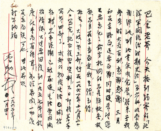 回蓉后,仍時感厥暈心跳。承組織照顧,許我靜養,故得專心寫作。只是每天僅能寫出千余字,多則不支。昨日血壓高度為一八〇度,在我不算高,惟低度為一二〇度,都過高了些?,F在再度澈底(徹底)檢查中。煙酒仍未入口。在成都吃水果蔬菜都較北京方便。希望尊駕能再蒞蓉小住為幸!此祝健康!