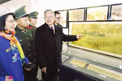 葉永烈向參觀者介紹他捐贈的《申江戰焰圖》,這是日軍侵華的有力罪證。本報記者趙立榮攝
