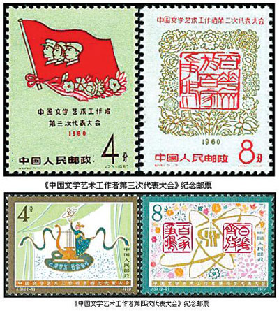 1960年7月22日至8月13日,中國文學藝術工作者第三次代表大會召開(1988年11月召開的第五次代表大會易名為“中國文學藝術界聯合會全國代表大會”)。1960年7月30日,原郵電部發行《中國文學藝術工作者第三次代表大會》紀念郵票,全套2枚。第一枚“文藝為工農兵服務”,圖案為鮮花簇擁的一面紅旗,紅旗上排列著工農兵頭像;第二枚“百花齊放 百家爭鳴”,圖案為鮮花映襯環繞的一枚刻有“百花齊放 百家爭鳴”八個字的朱紅篆刻印。全套郵票寓意文藝工作者要在中國共產黨的正確領導下,高舉為工農兵服務、為社會主義事業服務的旗幟,貫徹執行百花齊放、百家爭鳴和推陳出新的方針,大力發展中國文藝事業。