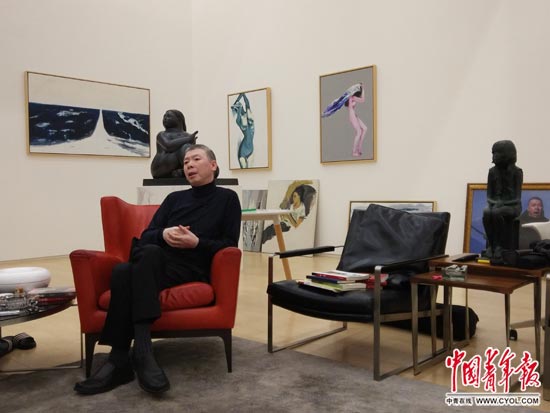 這個畫室里一切物體的色彩都有著高飽和度和對比度,和馮小剛的語言一樣利落。他隨意地倚坐在紅色的單人沙發上,說:“開始吧!”
