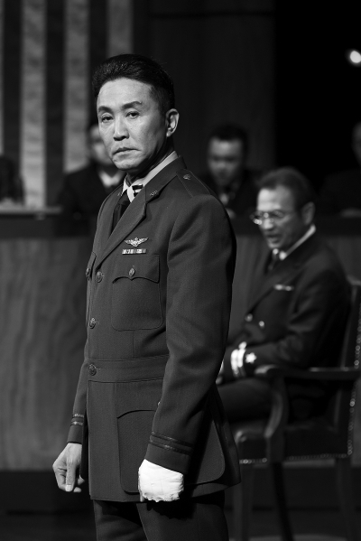 劇場里,開場鐘早已敲過三遍,格林渥穿著硬朗帥氣的軍人制服站在舞臺上,發絲根根锃亮,兩側剃得極短,帶著烏青。他巧舌如簧,質疑著每一個企圖為原告作證的人,他是被告的律師,卻以狡黠的詭辯取得了最終勝利;而走出法庭后,他才說出了潛藏內心的真實想法。