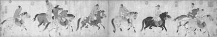 任仁發在繪畫過程中,常以鐵線勾勒、淡彩暈染,遵循唐代畫馬風格,并將人物與馬的場景描繪在同一幅畫卷中,此《五王醉歸圖》不僅題材取材于唐,畫法也師承于唐代韓干和北宋李公麟。描繪的是登基之前的唐明皇李隆基與他的四個兄弟出游飲酒,醉后騎馬返回時的情景。