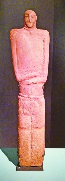 距今6000年的人形石碑是阿拉伯半島迄今發現的最早最著名的古代人類遺物。展廳中的三件石碑雕像雖然來自半島的不同地區,但人物造型具有顯著的相似性:整體長方,上身較方,鎖骨高聳,雙臂交叉,整體造型風格顯著,具有強烈的表現力。三尊雕像在衣著、神態風格上迥異,或許代表著古代阿拉伯半島不同村落和部族之間存在的風俗差異。