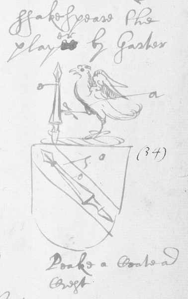 莎士比亞家族的盾徽大概是什么樣子,我們早已知道,因為莎士比亞墓碑的上方就有(圖2)。另外,早在1908年之前就已經有7幅莎士比亞盾徽草圖被3家機構收藏,位于倫敦的英國盾徽院藏有4幅,牛津大學圖書館藏有1幅,美國的福爾杰圖書館藏有2幅。這些盾徽草圖與之莎士比亞墓碑上的盾徽大同小異。盾冠是一只展開雙翅的隼。莎士比亞生前最喜歡這種猛禽,其著作中隼字出現的次數高于任何其他鳥名。隼的一只爪抓著一根矛(spear)的柄,用來會意構成Shakespeare這一姓氏的shake和spear(“搖動”“矛”)。盾徽本身的圖案是,以一條黑帶為背景,黑帶上一只矛斜貫整個盾徽,矛尖與筆尖相似,矛柄與筆桿相似。這恐怕不是偶然巧合,而是暗示威廉·莎士比亞的作家身份。福爾杰圖書館收藏的草圖中,有一幅的圖案下方標注著“戲子莎士比亞,襪帶騎士繪”的字樣(如圖3)。照理說,既然沒有任何證據表明倫敦當時有兩個同叫莎士比亞的戲子,或一個戲子,一個作家,盾徽草圖和墓碑上的盾徽便構成一個證據鏈,證明倫敦的戲子莎士比亞和葬于斯特拉特福鎮的莎士比亞是同一個人。然而倒莎派提出,這兩個盾徽都是莎士比亞去世之后雕刻或繪制的,不足為憑。