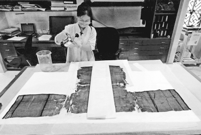 出土后“干時一把土,濕時一捧泥”,絲綢文物的保存是國際性難題。中國絲綢博物館和浙江理工大學用了將近十年的時間,研發出了一種神奇的絲織物加固技術。就像女人用睫毛膏輕輕一刷,睫毛立刻加長加密一樣,用絲織品加固液輕輕一噴,原來脆弱的絲織品就結實了。絲織品加固液所使用的原料本身就是絲的分解物,叫作絲肽—氨基酸,因此在手感、質地上,不會造成任何異樣感,被加固過的絲織品不僅外觀上沒有改變,摸起來手感也更加光滑細致,更加牢固,即使水洗,也不影響加固效果。這項國際首創的技術很快就受到國外同行的青睞,丹麥就用它加固女王漆器上的絲帶,效果很不錯。
