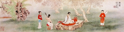 有宋一代,琴學大興,甚至引起封建帝王的濃厚興趣,“宋時置官局制琴,其琴俱有定式,長短大小如一,故曰官琴”(《格古要論》)。宋徽宗本人乃操縵名手,對傳世名琴更是汲汲以求,專設“萬琴堂”珍藏“南北名琴絕品”,并手繪《聽琴圖》以名世,蔡京題詩曰:“吟徵調商灶下桐,松間疑有入松風。仰窺低審含情客,以聽無弦一弄中”??梢姰敃r朝野上下,無不以能琴為榮,一部迎合最高統治者審美趣味的《洞天清錄》也便應時而生。