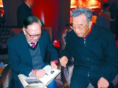 2012年,在文化部,賈作光(左)為高莽在《新中國早期文化交流口述記錄》一書的書頁上簽字。