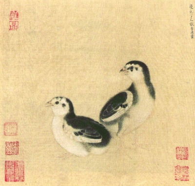 子母雞題材的流行,表明雛雞進入了畫家們的視野?,F存較早描繪雛雞形象的畫作,可能出自南宋畫家李迪。北京故宮博物院現藏有傳為他所作的《雞雛待飼圖》。畫面描繪了兩只雛雞背向而立,卻一同張望著畫面的左方。由于是描繪在絹素之上,畫家用精細的筆法描繪例如足部、翅尖等細節,又略微暈染出羽毛的邊緣,工致與意趣兼備,十分耐看。南宋興起了一種描繪田園風光和生活主題的繪畫,李迪便是主要代表畫家,這件《雞雛待飼圖》可能便是農村生產的寫照。而在傳統農業生產中,將大寒分為三候,認為“一候雞乳”,此時開始孵育雛雞,表明新春即將到來,可以為來年的農業生產做準備了,是十分重要的節氣標志,這可能也是李迪創作此畫的原因之一。
