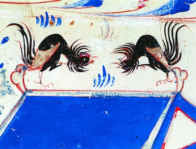 韓嬰將“文德”列為雞的“五德”之首,這使得墓葬中身著文人服飾的雞首人身形象不難理解。那么,雞的“武德”和“勇德”又如何體現在畫中呢?在莫高窟285窟中可找到相關的圖像。285窟以西魏時期創作的《五百強盜成佛故事畫》而著名,但很少有人會注意到在這幅精彩壁畫中的屋頂上還隱藏著一幅今天被稱為《斗雞圖》的局部?!岸冯u”作為至今依然存在的一種競技,想必讀者并不陌生。但是在畫中表現斗雞場面,莫高窟壁畫中現存的這個局部不僅是年代較早的,也是較為精彩的。畫中兩只毛色黝黑的雞相對而立,脖頸的羽毛炸起,雙腳撲朔,怒目圓睜,弓起脖子,張大尖喙,仿佛即將廝打在一起,場面十分緊張激烈。作者對斗雞的形態把握極為準確簡練,成功地把握住了精彩的瞬間,使得這幅《斗雞圖》今天看來仍令人嘆為觀止。類似的圖像在時代略早的嘉峪關晉墓壁畫中也有發現,可見是當時西北地區較為流行的一種畫雞題材。