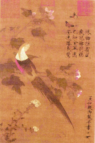 現存北京故宮博物院的傳為北宋徽宗所作的《芙蓉錦雞圖》,便是一件不同以往的雞畫佳構。這件作品看似簡單,描繪了一只俏立芙蓉枝頭的錦雞。這種錦雞不同于家雞,是宮苑中豢養用于觀賞的名貴品種。畫中的錦雞,羽毛華麗,回首凝視著畫面右上角的一對蝴蝶,目不轉睛。盡管同樣是圓睜著眼,卻全無《斗雞圖》中的殺氣,一副柔和呆萌的模樣。而它的目光所及之處,不僅有翩翩起舞的彩蝶,還有徽宗書寫的詩句:“秋勁拒霜盛,峨冠錦羽雞。已知全五德,安逸勝鳧鹥?!奔热灰呀浘邆淞恕拔宓隆?,那人生的至高境界已經到達,便可過起安逸的生活——這是徽宗對這件作品的注解。由斗雞的癲狂到錦雞的閑適,變化的不僅是畫面的內容,還有時代的風格與趣味。