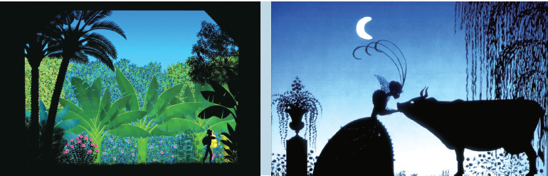剪影動畫與剪紙動畫有相似之處,即角色都用剪紙方式制作,并根據動作需求將肢體拆分為元件。不同之處在于,剪影動畫通過光線對角色的照射在銀幕上呈現出黑色的輪廓剪影,造型沒有進行顏色的區分,增強整體感的同時也摒棄了影調的細節。世界上較早采用剪影這一形式進行動畫創作的是德國女導演洛特·雷妮格,她最著名的作品是1919年的長片動畫《阿基米德王子歷險記》。雷妮格的剪影作品精致細膩,可惜的是,《阿基米德王子歷險記》的電影膠片在二戰中遭到損毀,遺失了部分背景細節。在修復后,由于放映速度的問題,影片長度也由90分鐘縮短為65分鐘。