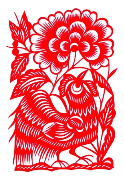 雞在古代中國被視為瑞禽,加之與“吉”諧音,更增祥瑞色彩。在民間,有“元旦畫雞于室”的風俗。清代周亮工《書影》記載:“按《歲時記》:‘正月一日,貼畫雞,今都門剪以插首,中州畫以懸堂,中貴人尤好畫大雞於石,元日張之,蓋北地類呼吉為雞,俗云室上大吉也??砂l一粲?!币恢活^戴紅冠的大公雞立于大石之上是花鳥畫常見的畫面,多稱作《大吉圖》,因“雞”諧音“吉”、“石”諧音“室”而寓意“室上大吉”。在中國傳統吉祥畫中,除了雞石構圖之外,雞與牡丹的構圖也較為多見,寓意“富貴大吉”,雞與荔枝的構圖則寓意“大吉大利”,一只大雞和五只小雞相戲于窠的構圖,因“窠”諧音“科”而寓意“五子登科”。雞畫題材還有金雞報曉、金雞迎春、聞雞起舞等吉祥寓意,作品層見疊出,深受人們喜愛。