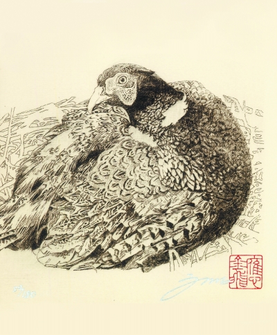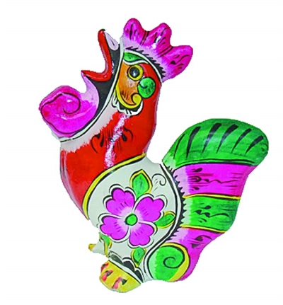 最廣為人知的雞年題材繪畫作品,當屬印在郵票上的生肖雞。雞年生肖郵票迄今已發行四輪,除1993年《癸酉年》的剪紙圖案出自河北省農民藝術家蔡蘭英之手外,其余三輪的圖案均為畫家所繪。1981年《辛酉年》雞票圖案由曾參與國徽設計的畫家張仃創作,采用裝飾畫法,描繪一只昂首報曉的雄雞,意在鼓舞人們奮發向上。2005年《乙酉年》雞票圖案由畫家呂勝中創作,采用中國畫寫意畫法,表現的是一輪紅日上方一只昂首欲鳴的彩色公雞,紅日與公雞巧妙組合成一個“酉”字,代表雞年。第四輪生肖雞票即為2017年最新發行的《丁酉年》特種郵票,全套2枚,圖案由北京奧運會吉祥物“福娃”的設計者韓美林創作,第一枚畫面上是一只威武雄壯的大公雞,第二枚畫面上是呵護幼子的雞媽媽與兩只可愛的小雞,表現了生肖雞幸福美滿的一家,既突出了雄雞起舞、大吉大利的生肖賀歲主題,又展現了和諧幸福的家庭生活,延續了2016年《丙申年》生肖猴票“合家歡”的主題。