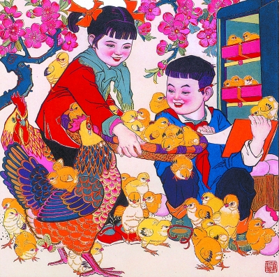 在雞畫作品大量產生的同時,畫中雞的數量也越來越多,從傳統的通常繪有一只大雞的《大吉圖》、兩只雞的《雙吉圖》、三只雞的《三吉圖》到一只大雞帶數只小雞的《五子登科圖》《教子圖》,發展到當代則出現了多幅《百雞圖》,最多的可能要算是北京奧運會前后推出的“千雞圖”了,據說畫面中共有2008只雞,真可謂熱鬧到了極點。