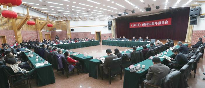 《詩刊》常務副主編商震匯報了《詩刊》近年來的發展情況?!对娍吩骶幦~延濱,詩人李松濤,評論家駱寒超,詩人曉雪、劉立云、玉珍等先后發言。大家從各自的角度,深情回望自己與《詩刊》一同走過的歲月,探討詩歌創作藝術和詩歌理論評論,對這份重要而特殊的詩歌刊物寄予新的期待。大家談到,自創刊以來,《詩刊》一直堅持與時代同行,與人民同步,刊發了許多載入中國當代文學史的詩歌作品,發現、培養了大批杰出詩人,引領了詩歌創作發展??梢哉f,《詩刊》60年來見證了我國當代詩歌的繁榮,已經成為我國廣大詩人和詩歌愛好者的精神家園。大家希望《詩刊》在新的歷史時期,以詩鑄魂,引領風尚,薪傳中國詩歌藝術傳統,以更多優秀的詩篇,為繁榮發展社會主義文學事業,實現中華民族偉大復興的中國夢作出更大貢獻。