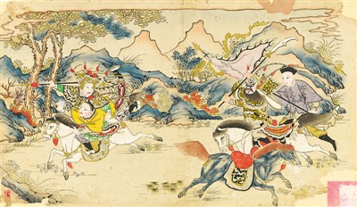 此外,還有一些作品屬于年畫畫師“點套”的粉本,即印出墨線版后,畫師直接在上面手工填色,刻工再據此分別刻出各塊色版。這類粉本過去在年畫作坊內秘而不傳,今朝得見,也是非常難得。這次展覽中的《雅觀樓》《逍遙津》《雁門摘印》《捉放曹》《年年太平》等,就屬于粉本中的精品。