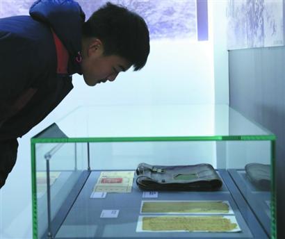 一名學生仔細觀看淞滬抗戰實物。張海峰 攝