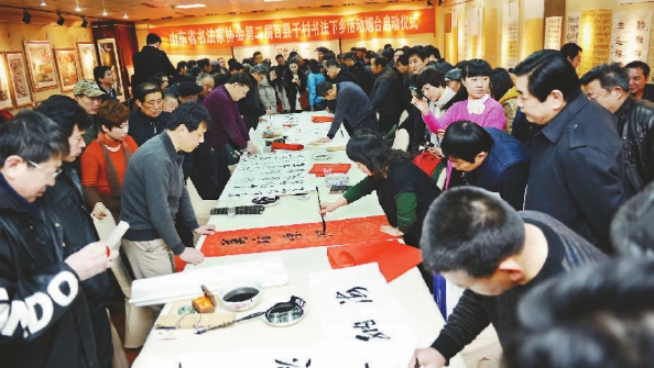 顧亞龍說,作為一名書法工作者,能夠通過我們實際的工作,為基層的老百姓多做些實事,我們山東省書協感到很欣慰和高興?!鞍倏h千村”活動開展以來,在山東省書協組織安排下,全省近2000名書法家走進百縣千村,開展文化惠民活動。