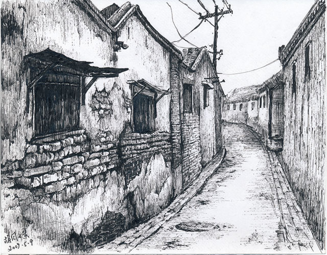 奚耀華說:“我畫胡同原本起于一種偶然,平時愛逛胡同,有胡同情節,于是拍了不少舊胡同的照片,日常辦公閑暇之時,便打開電腦,用辦公用的中性筆和便簽紙隨意描繪。漸漸地便有了一些感覺,對中性筆的筆性也逐漸掌握,于是一發而不可收拾??梢哉f沒有哪個畫家是專用中性筆作為繪畫工具的。我之所以一直沿用至今,一是因為自己并非專業,所用工具隨手拈來,信馬由韁;二是基于作品完成后的效果,與我理想的感覺很是接近,于是也不再想有所更換。中性筆兼有鋼筆的銳度和鉛筆的柔和,運用得當,對于描繪舊胡同的滄桑感,有獨到的筆意?;蛟S,這也可以成為我繪畫創作的一個特點?!保ㄐ〕蹋?/p>