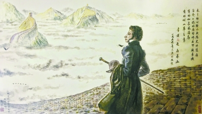 高莽,1926年出生,一生從事翻譯、編輯、俄蘇文學研究工作。高莽今年91歲了,在哈爾濱出生的他上的是俄國教會學校,從小就會用俄文背誦普希金的詩歌。普希金逝世100周年時,因為高莽畫畫好,老師讓他畫一幅普希金的畫像,并貼在了教室的墻壁上展覽。今年是普希金逝世180周年,遠在俄國阿爾巴特街的普希金故居博物館,為游客們準備的紀念品明信片的正面,是高莽1999年畫的《普希金在長城》。
