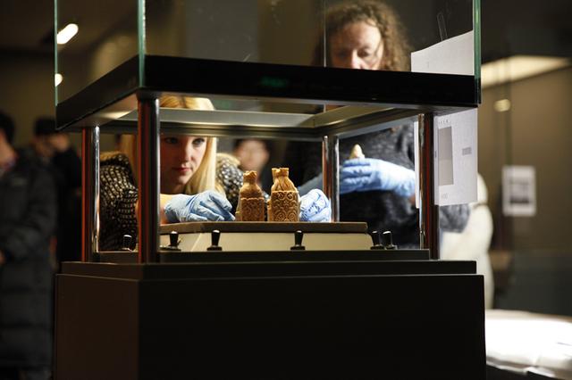 大英博物館工作人員在布展劉易斯棋子。 拍攝:周子杰