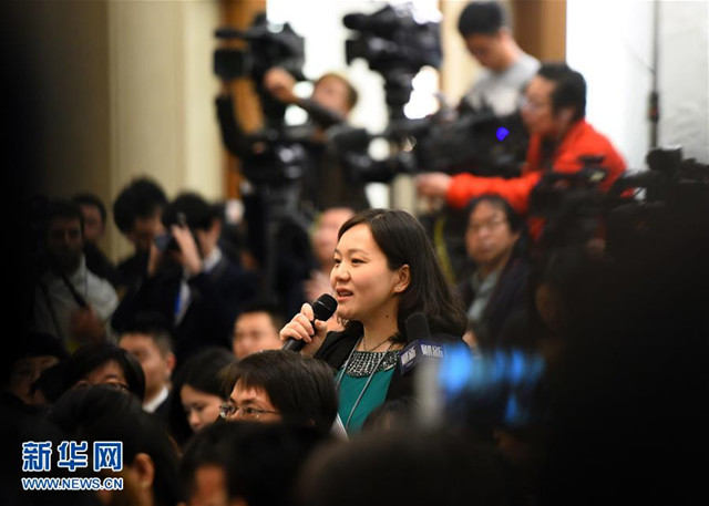 3月4日,十二屆全國人大五次會議在北京人民大會堂舉行新聞發布會。大會發言人傅瑩就大會議程和人大工作相關的問題回答中外記者的提問。這是記者在提問。新華社記者 陳曄華 攝