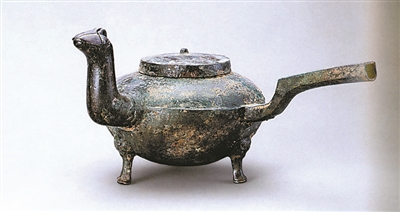 1963年陶然亭豁口外出土的雞首流鐎斗,通長14.2厘米。平蓋略鼓,蓋中央置一半環鈕,小口直沿,鼓腹,腹部置一雞首形曲頸流,首端可開合,與流呈90度角處有曲鋬,圜底,三蹄足。腹部飾一周弦紋,足根部飾以獸面紋。造型簡樸,為日常生活用品。