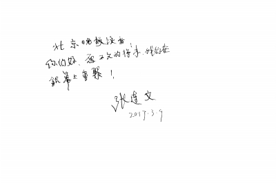 今年是雞年也是張連文的本命年,雖然老人現在行動不太方便,但他依然對表演事業充滿了熱情,在采訪的最后,他用左手顫抖著為《北京晚報》的讀者寫下這段話:愿不久的將來,我們在銀幕上重聚!