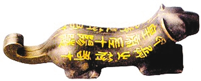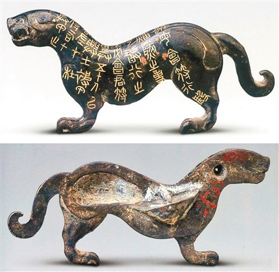 這枚 “戰國·秦·杜虎符”鑄于秦惠文君稱王前,秦國只有惠文君一人稱君,所以,杜虎符應是惠文君在位時制作的。而銘文中提到的“杜”地,為戰國時秦國杜縣,故址在今西安市南?!皯饑で亍ざ呕⒎鄙系你懳氖撬谐鐾粱⒎秀懳淖铋L的,且保存完好。特別是40個錯金字,是在虎身鏤刻陰文,再將金絲嵌入陰文之內,最后鏤平打磨光亮,雖歷經兩千多年,仍熠熠閃光。字體絕大部分是小篆,規整挺秀,反映了中國古代錯金工藝的高超水平。