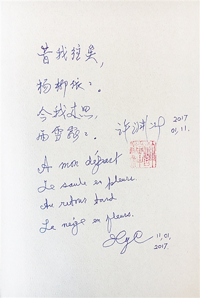 圖為許淵沖先生贈送給作者的漢法對照本《詩經》,扉頁上許先生用中文、法文抄寫了《詩經·采薇》的名句。