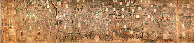 這鋪壁畫依托區區幾十平方米的墻壁上,卻將《大方便佛報恩經》《彌勒菩薩上生經》《大方廣佛華嚴經》這三部經卷極富創造性地架構成為一個完整清晰的關聯系統,把經變故事和世俗的社會生態完美結合起來,堪稱人類文明和社會進步史上的經典之作。