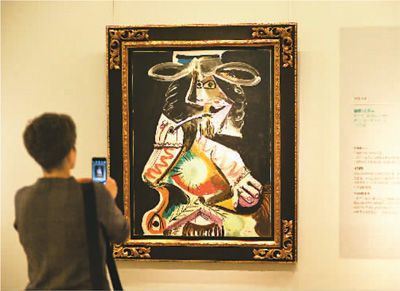 圖為觀眾在中國美術館參觀畢加索的作品《抽煙斗的男人》。