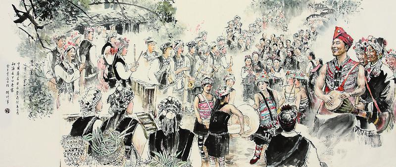 雨過天晴,采風團一路驅車,沿山蜿蜒而行,穿過潮濕茂密的山林,當踩著泥濘的道路進入山寨口時,丫口老寨沸騰了。山歌響起,竹筒搗地,鞭炮齊鳴,身著民族服裝的男女老少夾道歡迎,載歌載舞,表達著真誠和熱烈。藝術家們和愛尼人一起握著手,熱烈的掌聲,悅耳的山歌,把活動推向了高潮。那種由真情渲染的氣氛、節奏歡快的歌舞,朝氣蓬勃的青年,富有生命力的個性形象,親切的話語……猶如自然天成的畫卷,給人留下了深刻而難忘的感動和記憶。我每當想起這些揮之不去的見聞,心里難以平靜,促使我拿起畫筆,用中國畫寫生的筆墨語言,用自己的心靈記錄這一不尋常的時光,那些活在自己心中看似平凡卻是非凡的衣食父母——群眾,是一種責任感促使自己以人民為藝,表現他們,創作出國畫《老寨迎來藝術家》,再現古老山寨的沸騰場景,并在創作過程中進一步深入感受和理解藝術與生活密不可分的辯證關系,這也正是當下要經常自我提醒并見之于行的。