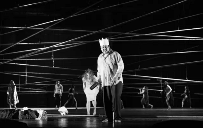 斜橫交錯的線條,空的舞臺,水,水桶,也許是皇家宴席中的瓶子,刀,還有紙作的王冠,凡此種種,重新定義了《麥克白》里的世界。