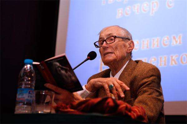 11月16日,在首師大為葉夫圖申科舉辦的詩歌電影晚會上,我這樣介紹葉夫圖申科:“他或許是所有健在的俄語詩人中最具世界性影響的人,作為‘響派’詩歌最突出的代表,他和他的詩歌在上個世紀六七十年代風靡全蘇聯,享有當今的歌壇天王天后們才享有的名頭,他在盧日尼基體育場的朗誦會有數萬聽眾,他站在敞篷汽車上朗誦,成千上萬的人向他歡呼,向他致敬;他到過世界上91個國家,他的詩被翻譯成數十種文字,他在俄羅斯被視為‘活著的經典’,‘俄語詩歌的大使’;其次,他或許是當代俄語詩人中與中國淵源最深的人,早在1985年他就訪問了中國,是在改革開放后最早訪問中國的蘇聯作家之一,他在國際俱樂部的朗誦,他與中國詩人的見面,都在當時的中國詩歌界、乃至文學文化界產生巨大影響,掀起了一場‘葉夫圖申科熱’?!薄叭~夫圖申科先生有一句名言:‘詩人在俄羅斯大于詩人?!约壕褪沁@句話的范例,從廣義上說,他不僅是一位詩人,也是一位文化活動家,社會活動家,是20世紀下半期俄蘇政治文化史中的一個歷史人物;從狹義上說,他不僅是一位詩人,也是一位電影導演、演員、小說家、評論家、翻譯家、攝影家等等?!蓖頃?,葉夫圖申科在詩歌朗誦環節之后又親自為我們講解他執導的影片《幼兒園》。