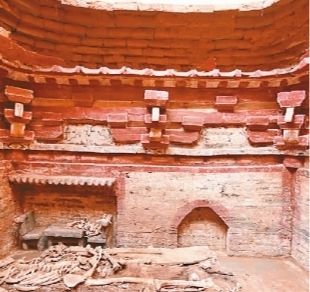 據介紹,該墓葬為一仿木結構彩繪磚雕墓,由墓道、墓門、封門和墓室等四部分組成,墓道南向。墓道為長方形豎井式,斜坡底;墓門券頂,條磚封門;墓室為磚砌,平面呈方形,疊澀頂,方磚鋪地。墓室裝飾磚雕仿木結構,包括倚柱、闌額、普拍枋、斗拱、橑檐枋、檐椽、望板、滴水等建筑構件,四壁還用磚雕砌有假門、桌椅、燈檠等。室內壁滿抹白灰,并施紅、黑、黃彩,其中普拍枋、闌額、拱眼、墓門彩繪有花草紋、波折紋和雷紋,假門兩側還用黑彩繪有人物。根據墓葬形制、裝飾風格及出土器物特征,專家初步推測墓葬年代在金元時期。
