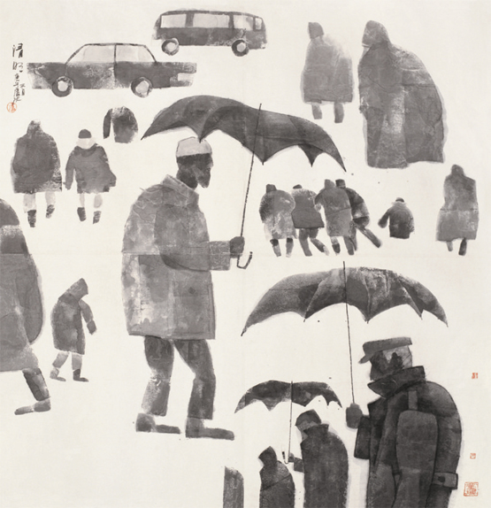 盧沉的探索不僅停留在造型與筆墨層面,上世紀80年代在現代化的大背景下,他追求抽象的思維能力,將西方的構成意識、形式分析的方法應用于水墨畫創作之中,《清明》是這一時期的代表作?!肚迕鳌繁憩F的是清明雨季路上撐傘的行人,用幾何形的平面造型表現人物的側影、背影,通過形式分析的方法把畫面進行了有意味的分割,也輔助指引了觀者的欣賞順序。畫面整體的淡墨著色,傳達出一種寧靜的氛圍與悲傷的情緒。這幅畫于1990年創作完成之后在中國美術館和深圳美術館展出,引起了畫壇對盧沉創新精神的進一步關注。