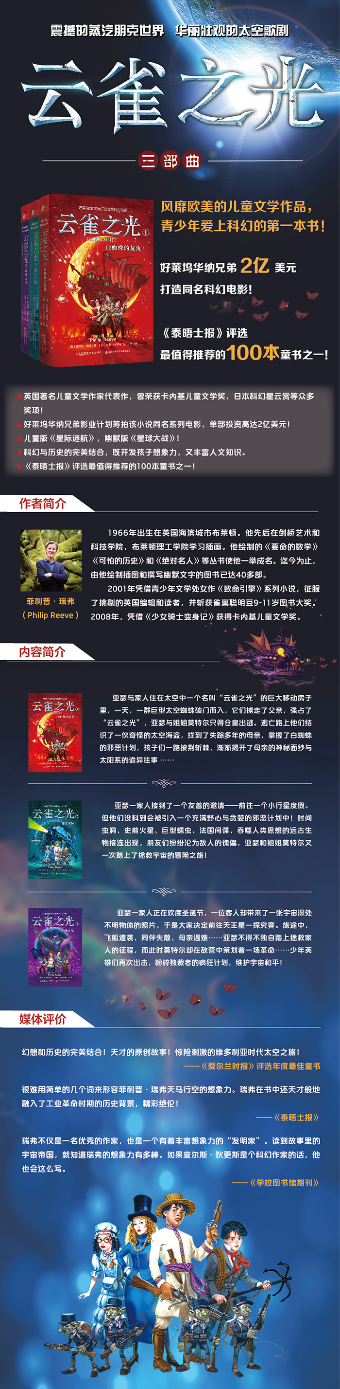 好萊塢2億美元打造同名科幻電影!《泰晤士報》評選值得推薦的100本童書之一。真實的歷史背景,震撼的蒸汽朋克世界,華麗壯觀的太空歌??!青少年愛上科幻的書!