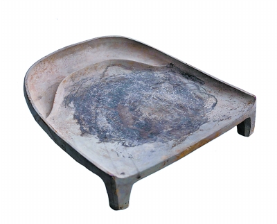 此硯規格碩大,長達32厘米,寬27.5厘米,高5.7厘米。外形呈“風”字狀,雙足,故稱雙足風字硯。此種風字硯又因形制類似農具簸箕,也稱箕形硯。泥色灰黃,色澤華美,質地堅密細膩。硯體土銹浸蝕,硯堂墨銹斑駁,植物根須沁于硯表,跡近鈣化。硯堂與墨池之間有月牙形攔水墻相隔。此硯為盛唐時制品。出土、傳世各有一款同類硯品可以互證。