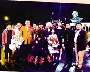 第三次則是2015年,天津舉行牧村從藝45周年音樂會。鐵鑫和我們兩家買了5張888元的票,一早驅車赴津助陣。當晚的演出極其感人,先是牧村當年的工人師傅登臺同唱,接著牧村即興發揮,大聲說,我北京的群親們也來了,他們當中有著名的男中音歌唱家佟鐵鑫……這話像一枚炸彈扔進了觀眾席,毫無準備的鐵鑫被我推了上去,因為匆忙,連衣扣都沒扣好。臺上,牧村興奮地說:“當年,光南老師說,他最喜歡的男中音是佟鐵鑫?!辫F鑫用這么一句話回答了她:“施光南老師還說過,他最喜歡的女中音是關牧村?!?/p>