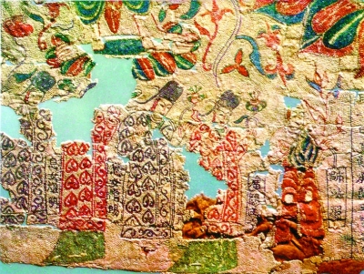 此外,絲綢之路上的刺繡針法在歷史上還出現過“加物繡”,如釘珠繡。1997年在昭蘇波馬黃金墓出土的一塊長25厘米、寬13厘米的金珠繡綺殘片上出現了“珠繡”。我國古代文獻中曾記載一種稱為“珠服”“珠襦”的面料,但幾乎沒有人見過它究竟是什么樣,波馬墓中出土的“綴金珠繡”讓人大開眼界,似乎便是傳說中的“珠服”。其針法上出現了珠繡,而其圖案與配色顯然又深受西方文化的影響。