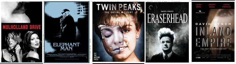《穆赫蘭道》電影海報、 《象人》電影海報、     《雙峰》電影海報、   《橡皮頭》電影海報、    《內陸帝國》電影海報