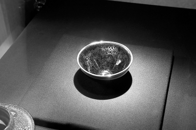 這只曜變天目茶碗,寬12.3厘米,高6.8厘米,產于福建的建陽窯,是宋人用來喝抹茶的茶盞。茶碗顏色黝黑,碗內有一個個油滴光圈,在油滴之間,有一片片藍色的光斑,如果轉著看的話,會看到碗內閃爍的光芒會變幻顏色,顯得越發神秘。碗內黑釉的底色,仿佛就是宇宙太空的顏色,而一片藍色的光斑,仿佛是天際的銀河,周圍一個個光圈,仿佛是小小的星系,它們在碗內閃耀著魅人的光輝。這種碗在中國已經失傳,2008年,在南宋皇宮遺址出土過一個殘片。曜變天目在燒制工藝上特別困難,因為窯內溫度要達到1300度,且只能允許10至20度的變化,在高溫冷卻的后期階段里,溫度突然升高后迅速下降,讓釉內鐵結晶快速融化再冷卻,周圍出現薄膜,形成曜變的效果。這種工藝太過困難,刻意燒造的成功率也只有十萬分之一,說它極其珍貴,并非是一句空話。