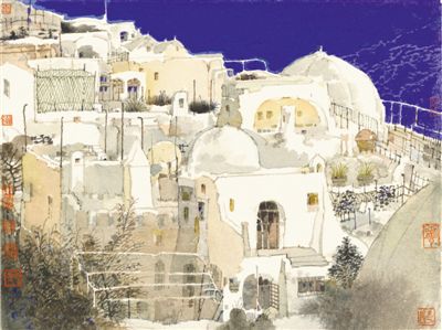無疑,絲路沿線尤其是異國他鄉不同的人文風物,對于創作者而言,是一種新鮮的視覺刺激,容易激發藝術靈感,也在觀看方式、取景角度、傳統筆墨程式、章法布局等方面,對創作者提出了挑戰。面對以山水為主體的第一自然,以城市為主體的第二自然,盧禹舜以匠心和慧眼觀察體悟,宏觀探道,微觀寫真,在心手相應的藝術創造中,依托中國山水畫傳統,在筆墨、章法、賦色等方面進行了重構——意象的疊加,改變了慣有的虛實處理方式,天空或遠山對色彩的運用,讓畫面更具現代感;焦點透視的運用,突出了建筑等人文景觀,強化了畫面布局的實景視覺體驗;水彩色的介入,改變了色墨的比重和藝術的氣息,讓畫面或更加清靈、透明,或更加靜謐、深邃……對當代人感性經驗和視覺感受的表達,讓盧禹舜突破了以往的裝飾畫風和程式化的技法表現,既實現了藝術情感的深度表達,也讓崇尚自然的精神境界更為廣博多元。他在寫生中強化了藝術的重構能力,也完成著對傳統、寫生和自身經驗的多重超越。