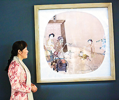 中國刺繡有著比紙上繪畫更悠久的傳統,參展藝術家、國家級“非遺”傳承人姚慧芬用上百種不同的針法來再創作李嵩《骷髏幻戲圖》、馬遠《十二水圖》這兩幅宋代古畫。當皮影、刺繡和實時錄像、動畫、自動機械表的表演配合展示時,給人一種時空交錯的感覺。