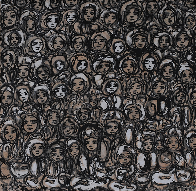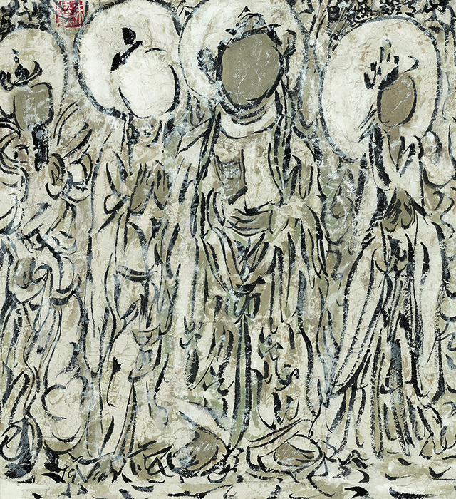 朱振庚早期的水墨作品是從畫壇主流的現實主義的水墨體系中承襲而來,但在他研究生畢業之后,受現代思潮的影響,他的水墨語言開始走向現代重彩的構建。從重彩到水墨是中國繪畫史上的發展歷史邏輯,而從水墨再到重彩,則是在現代語境下朱振庚尋求傳統繪畫的當代轉型的路徑之一。朱振庚言:“中國藝術必須依托于現代藝術這個背景才能活躍起來,現代重彩切忌‘洋味’重彩,需從中國文化精神中生得主根,尊重傳統(但不迷信傳統),涉獵中外,吞吐古今,創造新的傳統?!敝煺窀龑τ谥形鱾鹘y有著很明確的態度和立場,這種對傳統文化的自信和自知是他藝術創作中民族性的保證。在他的重彩畫中,不僅汲取了西方現代主義繪畫中的造型和構成等諸因素,還從中國民間戲曲美術中借鑒了形象和色彩等諸手段。民間壁畫的肌理感承載著歲月流沙的痕跡,也被他轉化為重彩語言的符號,成為畫面形式感的修辭。朱振庚在構建現代重彩的視覺體系之中,充分調動了“色”“墨”“粉”三種元素,參照古代壁畫的手法,他以墨筆隨形生發,以色寫染,再以粉色筆,三種元素各自為用,在銀灰色調的肌理趣味之中,交錯碰撞,又渾然一體,下筆意氣所到,生機勃勃,韻味于厚重疊加中產生。朱振庚深刻的認識到中國藝術中的“寫意”精神,并將之轉化在重彩圖式之中,他注重筆法,講究筆力與筆趣,認識到在重彩畫中筆力與賦色之間的辯證關系,以筆力為骨,強其骨氣,色彩方能神化,若筆力有虧,畫面色彩則浮于表面,空善賦彩,徒生火氣。筆趣則是筆精墨妙之中顯現的趣味,而趣味的產生則是畫家學養、情緒與才情的統一,他追求“無羈無絆之美”,任筆觸自由表現,靈動之中不失法度。