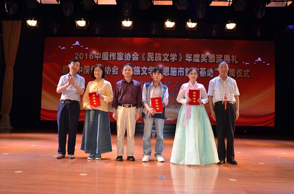6月3日,2016《民族文學》年度獎頒獎典禮暨“中國作家協會《民族文學》恩施市創作基地”授牌儀式在湖北恩施舉行?;顒佑擅褡逦膶W雜志社、中共恩施市委、恩施市人民政府主辦,旨在促進少數民族文學創作,組織作家深入生活、扎根人民,更好地發揮文學期刊的引領和服務作用。