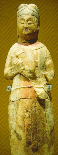 西漢以后,絲綢之路的開通,進一步促進了東西方文化交流。山西太原隋代虞弘墓中出土了一批反映中亞文化的文物,對研究北朝至隋代中西文化交流、絲綢之路具有重要價值。本次展出了虞弘墓中的兩件人俑,一件是高鼻深目的持壺男侍俑,另一件是反彈琵琶、腳踩蓮花座的女伎樂俑,都帶有明顯的外來文化特征。