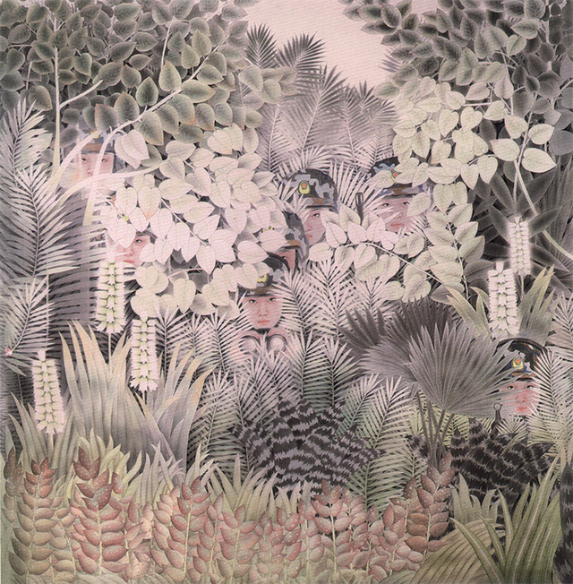 縱觀付詠珊的畫,多以工筆為主,格調高雅,題材多樣,個人風格鮮明,富有濃郁的生活氣息。也許是身為軍人的緣故,她的大型畫作多為歌頌軍旅題材為主調,如入選第十一屆全國美術作品展并被評為全軍優秀作品的《潛伏》。從內容上看,《潛伏》描繪的是一個充滿現代科技信息的軍事演習場景,在長寬均達兩米多的畫卷上,一支全副武裝的女兵小分隊三三兩兩隱匿在濃密的山野叢林中,她們神情警惕,目光犀利,精神抖擻,有的背著雷達、電臺等現代通訊工具,仿佛在整裝待命,有的手持望遠鏡,仿佛在觀察敵情,渾身的迷彩已和碧綠的山色融為一體。從手法上看,《潛伏》是一幅大型工筆畫,畫家在設色方面采用了以淡墨、透明色為主的淡彩法,表現出一個淡雅清秀、朦朧靜幽的境界,畫面內容豐富而含蓄。這幅畫作雖沒有威武雄壯的陣列,雖沒有排山倒海的氣勢,卻能以小見大,從一個側面形象生動地反映了我軍英勇善戰的優良傳統和朝氣蓬勃的精神風貌,體現了科技強軍的卓著成果,更標志著我軍在新的歷史時期已經具備了履行新使命、完成多樣化軍事任務的能力。因而這幅畫不僅受到廣大部隊官兵的喜愛,也得到美術界同仁和專家學者的好評。真可謂,休說女兒筆墨無斤兩,內有千軍萬馬藏。