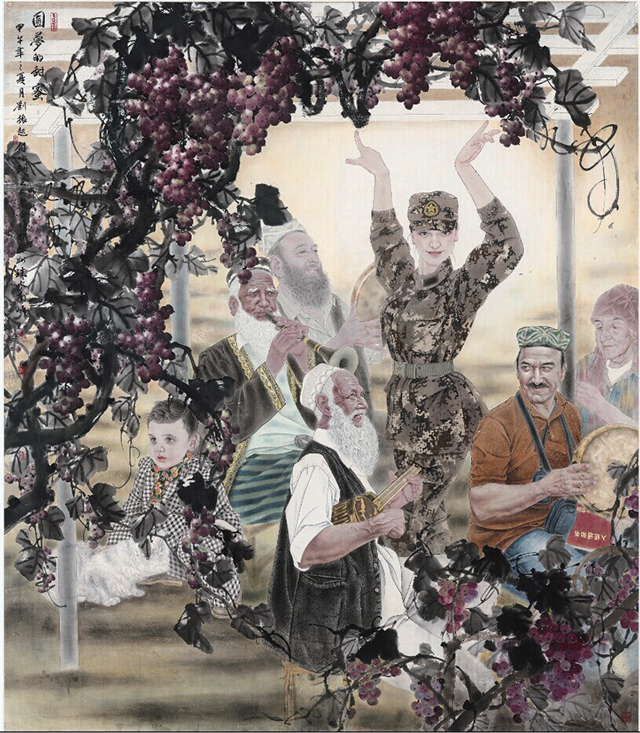 如果說,工筆人物是付詠珊的主要特色,那么,寫意人物和花鳥同樣也是她的專長。早在2000年,她的作品《竹林七賢》就曾獲得山東省首屆“水滸杯”書畫大賽金獎。此后,《秋韻》《秋實》《傲霜枝》《融合》《科學開出幸?;ā贰锻跽丫贰哆@里的黎明靜悄悄》《小旗手》《南粵新綠》《圓夢的甜蜜》等一系列作品多次入選重要美術展覽、獲得各類獎項。這些榮譽的取得,很大程度上與她的努力和付出是成正比的。誰曾想到,付詠珊白天有繁忙的工作事務要處理,而每當夜深人靜、萬物入睡時,她還在燈下忘我作畫;誰曾看到,每當萬家團圓的節假日,付詠珊卻默默背著畫具外出采風、寫生……無論在工作還是在藝術上,她都是名副其實的“排頭兵”。